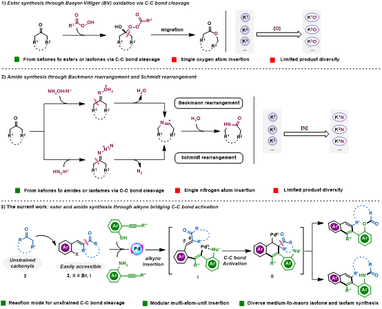 将氧或氮原子插入易得酮的碳-碳(C–C)σ键以形成酯或酰胺,构成了诸如Baeyer-Villiger氧化、Beckmann重排和Schmidt重排等经典反应的基础转化。尽管这些传统反应长期以来一直是合成化学的基石,但其适用范围本质上局限于在羰基邻位进行单原子(O或N)插入,无法同时引入其它结构单元以构建更复杂的分子架构。鉴于酯类和酰胺在生物活性天然产物及药物分子中的普遍存在,开发以简单原料为反应物,发展快速、结构多样化的高效合成方法具有重要的研究价值。