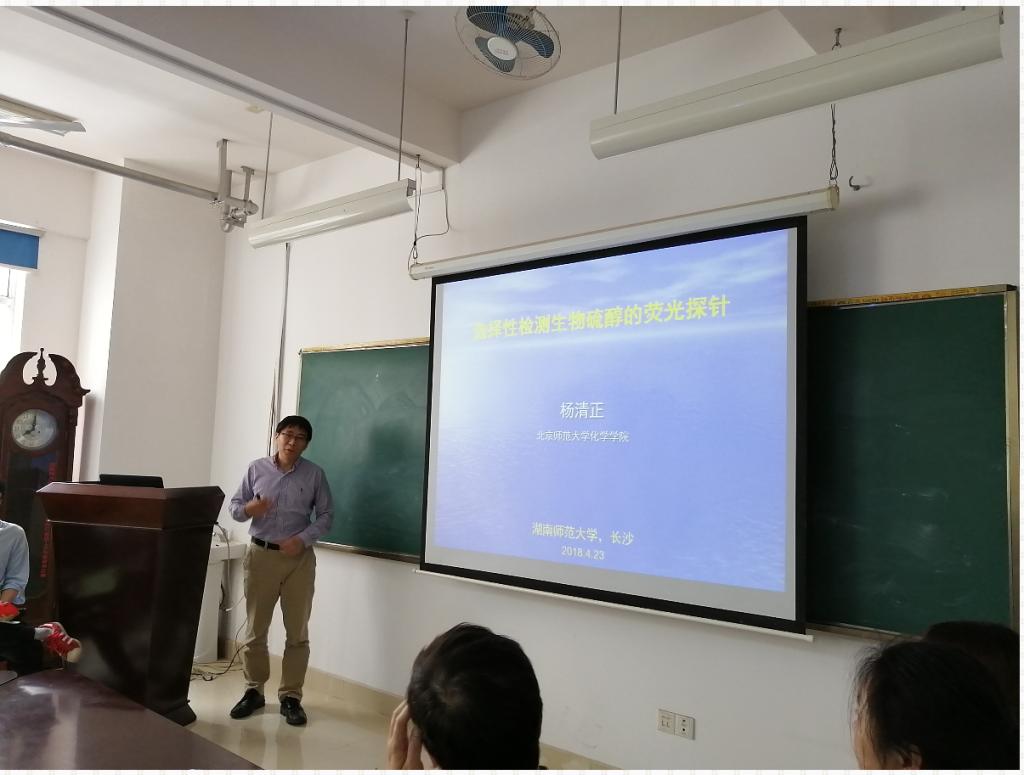 2019年4月23日下午,北京师范大学杨清正教授做客化学化工学院,为我室师生带来一场题为“选择性检测生物硫醇的荧光探针”的学术报告。报告由我院谢青季教授主持,实验室部分老师、研究生聆听了此次报告。